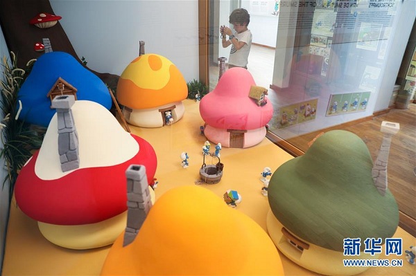 8月12日,在比利时首都布鲁塞尔比利时漫画博物馆,一名儿童拍摄蓝精灵玩偶和房子。 新华社记者郑焕松摄