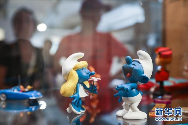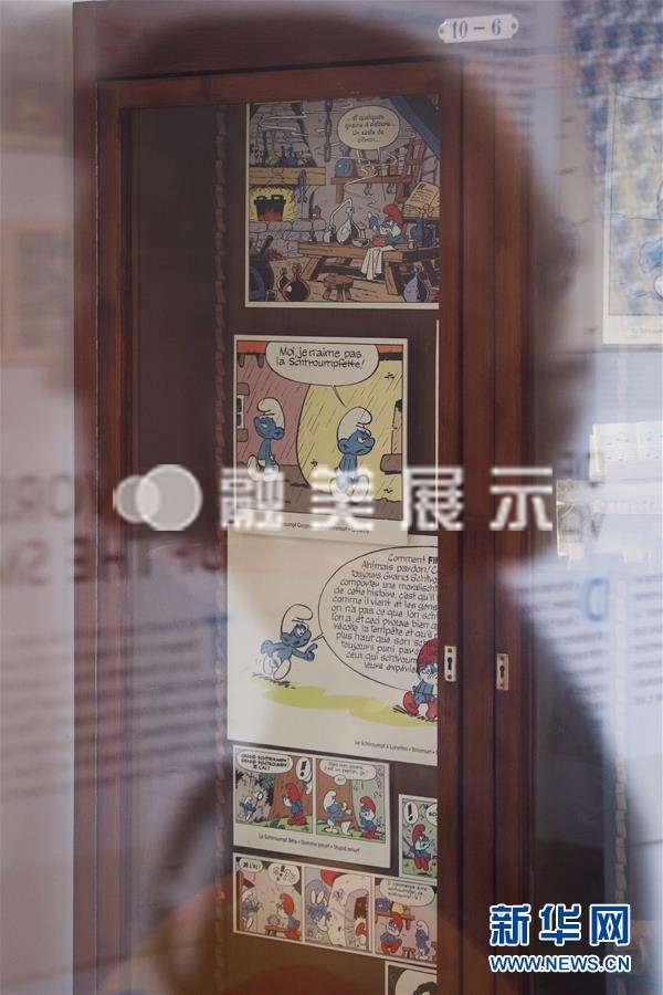 这是8月12日在比利时首都布鲁塞尔比利时漫画博物馆拍摄的蓝精灵玩偶。 新华社记者郑焕松摄
