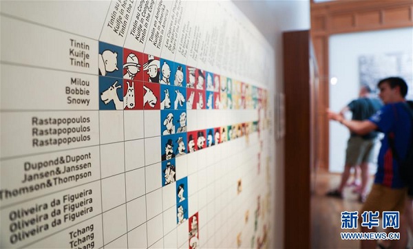 8月12日,在比利时首都布鲁塞尔比利时漫画博物馆,游客观看漫画《丁丁历险记》中的人物关系图。 新华社记者郑焕松摄